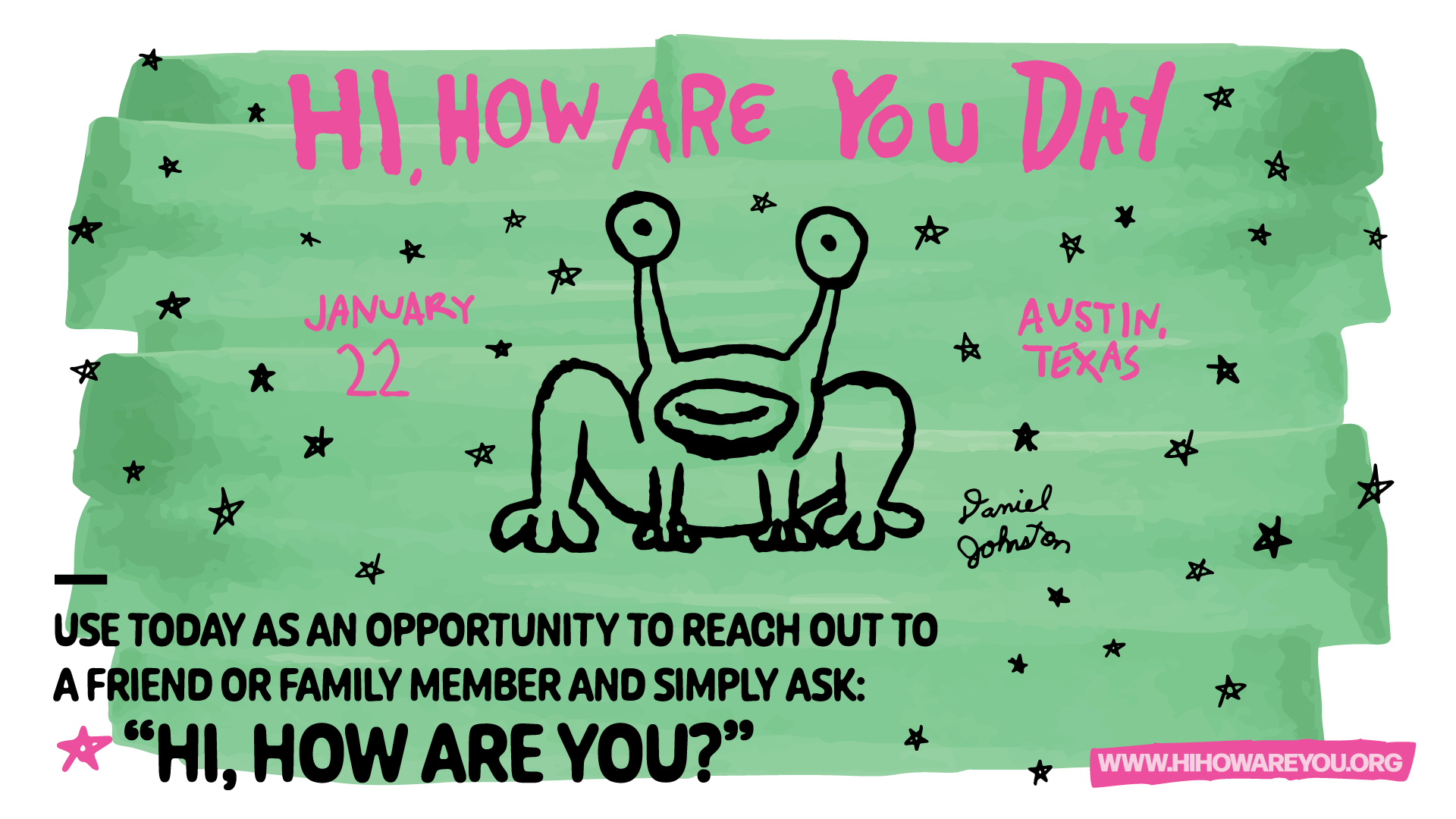 The Hi, How Are You Project, a 501(c)(3) non-profit, educates young adults worldwide on mental health through creative content, events, and community programs. Inspired by Daniel Johnston's Austin mural, it honors his legacy while promoting mental wellness.